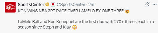 北京时间4月13日,NBA常规赛继续进行,黄蜂队110-96击败尼克斯队。克努佩尔此役三分球10投3中得到14分,拉梅洛-鲍尔三分球16投5中得到19分。最终,克努佩尔本赛季投中273记三分球,力压拉梅洛-鲍尔(272记),当选本赛季三分王。